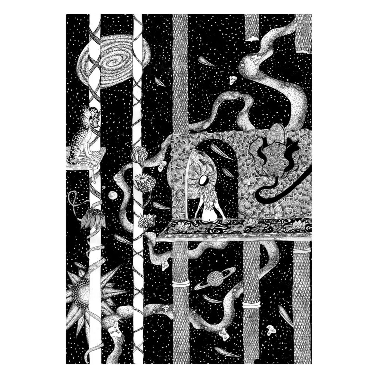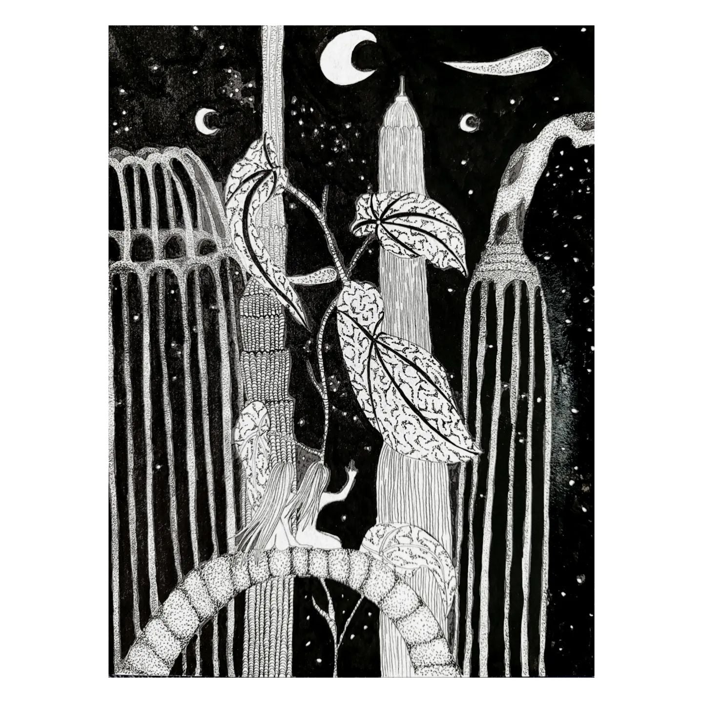 Inspirée par différents univers dont la mode, la nature et les lignes urbaines, les illustrations à l’encre de chine de Diane oscillent entre architecture et botanique surréelles.